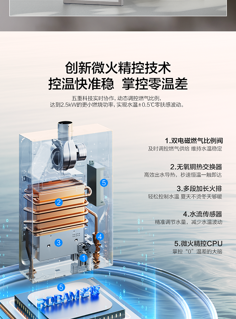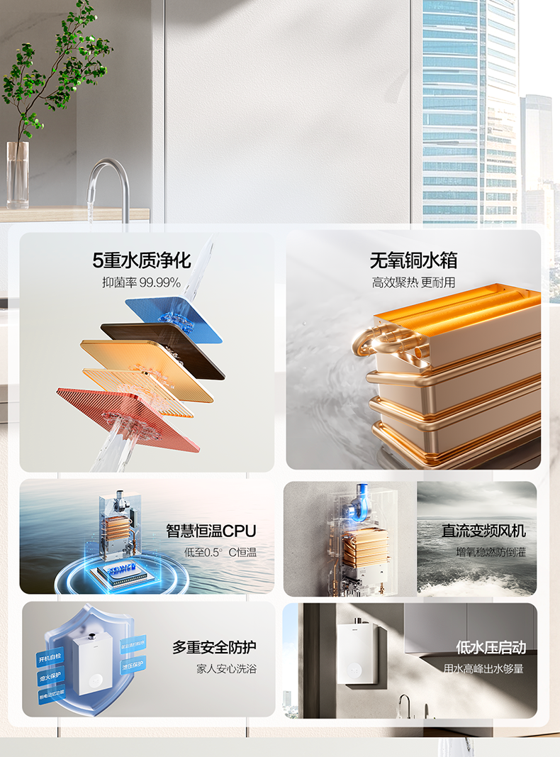 微火精控技术、五重水质净化、低水压启动